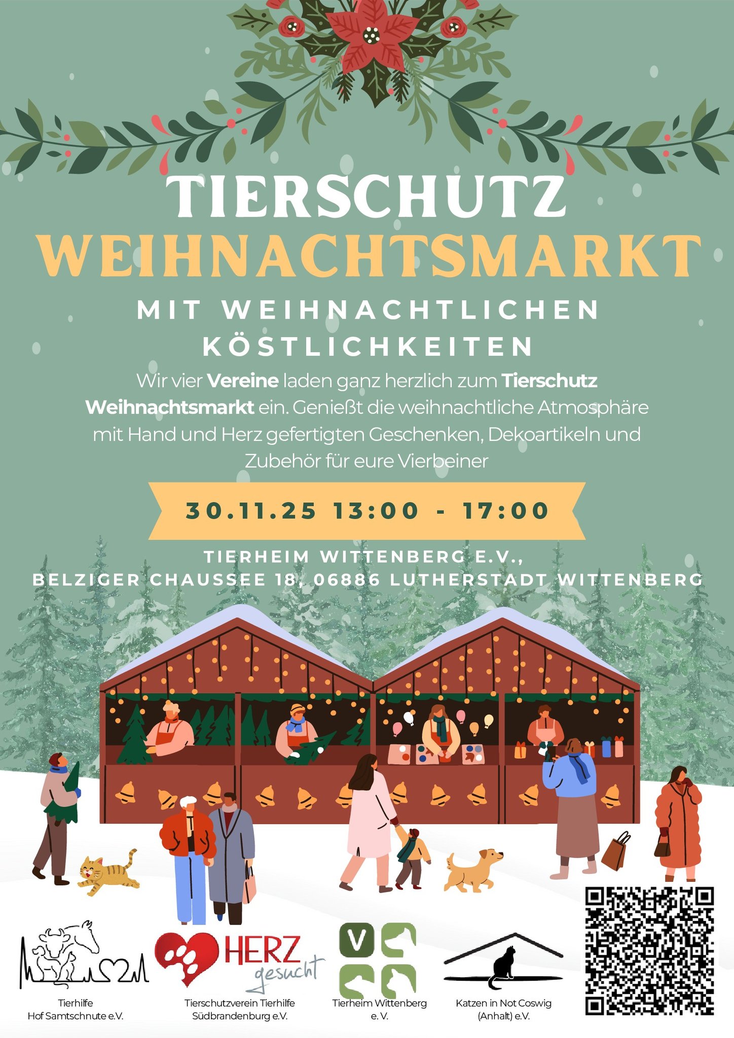 Terminkalender auf und zum 30.11.25 blättern, denn dann ist es soweit. Von 13 – 17 Uhr möchten wir – der Tierschutzverein Tierhilfe Südbrandenburg e.V., das Tierheim Wittenberg e.V., der Katzen in Not Coswig / Anhalt e.V., und die Tierhilfe Hof Samtschnute – mit euch gemeinsam den Nachmittag bei weihnachtlichen Köstlichkeiten und mit Hand und Herz gefertigten Geschenken, Dekoartikeln und vielem mehr verbringen.